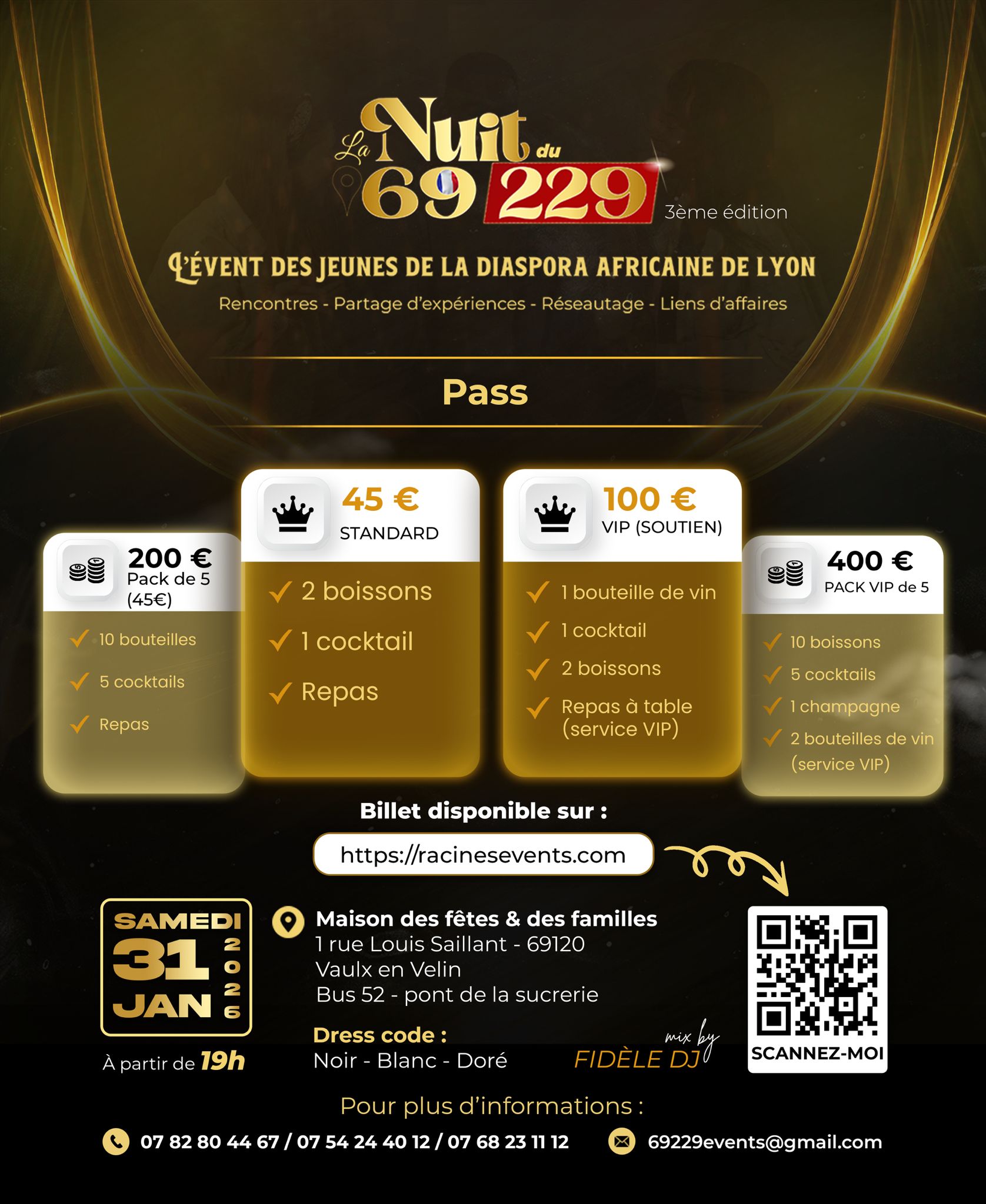 Née à Lyon avec l’ambition de rassembler les jeunes Béninois, La Nuit du 69-229 est devenue au fil des années un rendez-vous incontournable de la jeunesse africaine en France.C’est un moment unique où l’on célèbre notre identité, nos cultures et nos ambitions communes. Un espace où se mêlent rencontres, échanges, réflexion et festivités, pour tisser des liens solides et construire ensemble l’avenir.